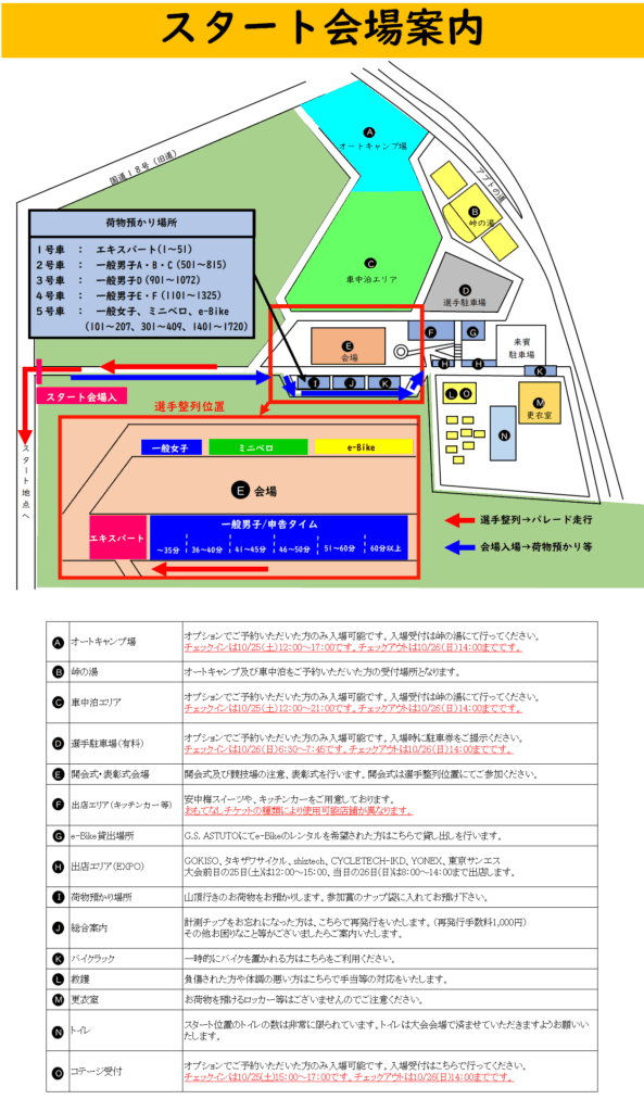 パレード走行について、エキスパート・一般女子・ミニベロ・e-Bikeのカテゴリーにエントリーされた方は、各カテゴリーのエリアに整列していただき、スタート位置へ移動となります。
