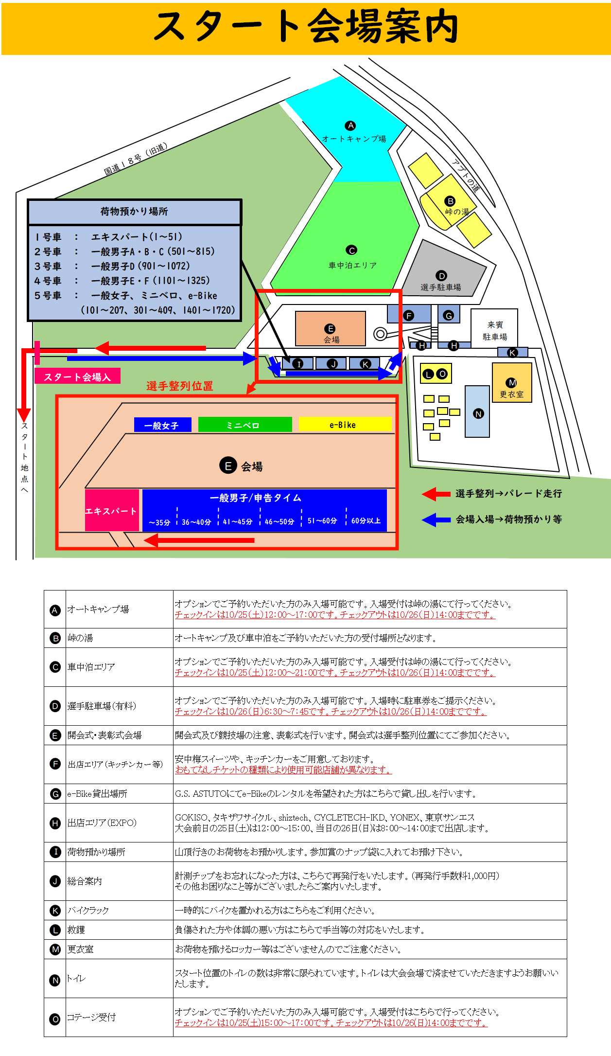 パレード走行について、エキスパート・一般女子・ミニベロ・e-Bikeのカテゴリーにエントリーされた方は、各カテゴリーのエリアに整列していただき、スタート位置へ移動となります。