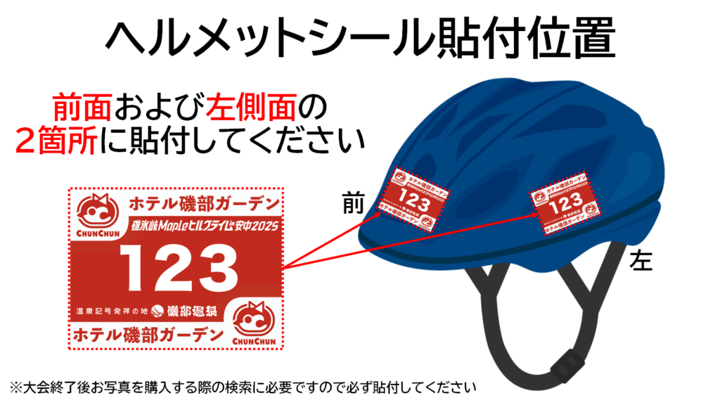 ヘルメットシールはヘルメットの前面と左側面の2箇所に貼り付けてください。