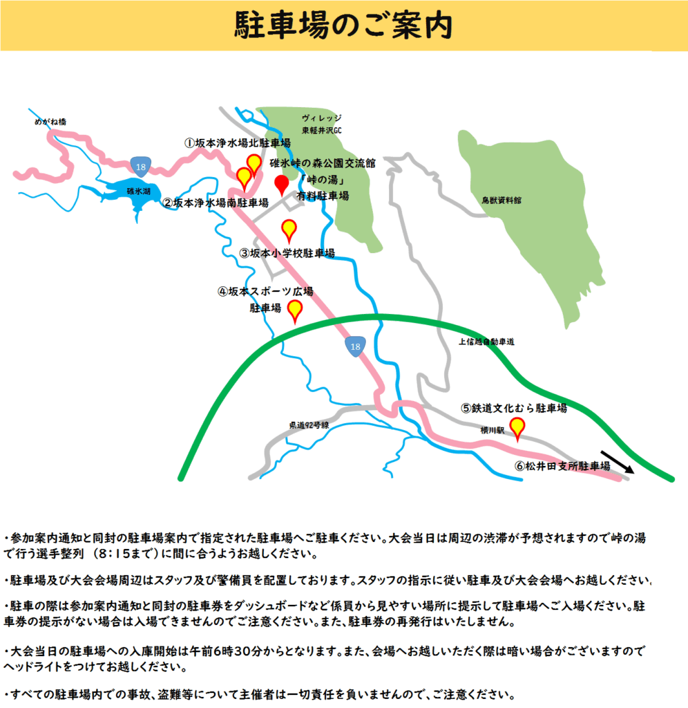 駐車場のお申し込みをされた選手の皆様には事前送付した物品の中に駐車券を同封いたしました。